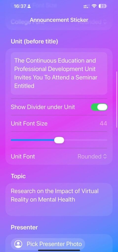 Announcement Sticker App lets you design professional, high-quality announcement posters in minutes. Easily add logos, unit names, topics, presenter details, and customize fonts, sizes, alignment, and dividers